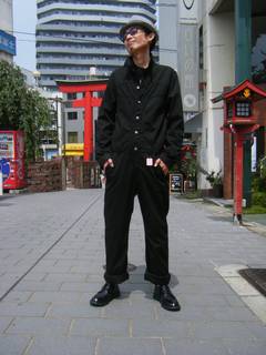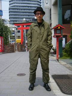 え~,扇風機が工業デザインっぽかったので、工業的アイテムつながりでオールインワンを着てみました。