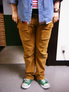次は、シルエット。少しO脚型なんですが、内膝の辺りにダーツが入っている為にできるシルエットが、絶妙でイイんデス!!詳しく説明すると、、、細すぎず、細く見せてる!ダーツ+ダック素材がかなり効果をだしています。
