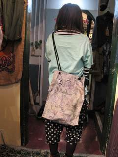 アリスの絵がコラージュされているプリントは淡い色味で春らしさを感じます。帽子屋の缶バッチがついていて、にくい!!紐は調節可能です。