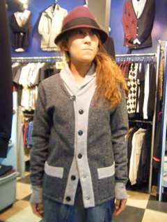 コンサバティヴなカーデガンと、金属的なジッパーの感触がとてもいいマッチングです。もっとも、ジッパーは金属的、というより、金属でした。