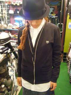 首周りから前立て部までジッパーをあしらったパンキッシュなカーデガンです。