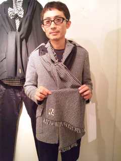 左の、千鳥格子のジャケットは、大きなストールをエポレットに通して着る提案。