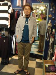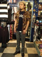 ファンキーなシャツでコーディネート!ボトムはオアグローリーのスラックス。